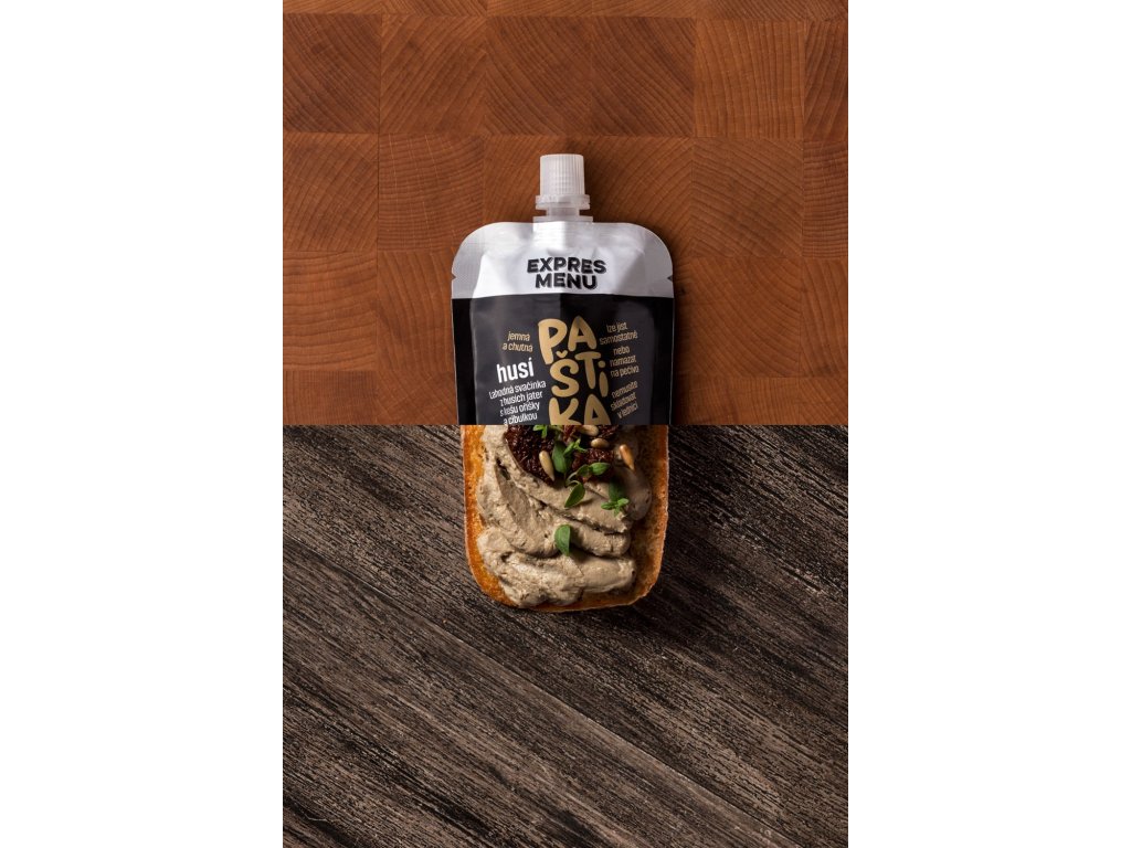 Sterilovaná homogenizovaná pasta z hovězího masa, husích jater a zeleniny k přímé konzumaci.
