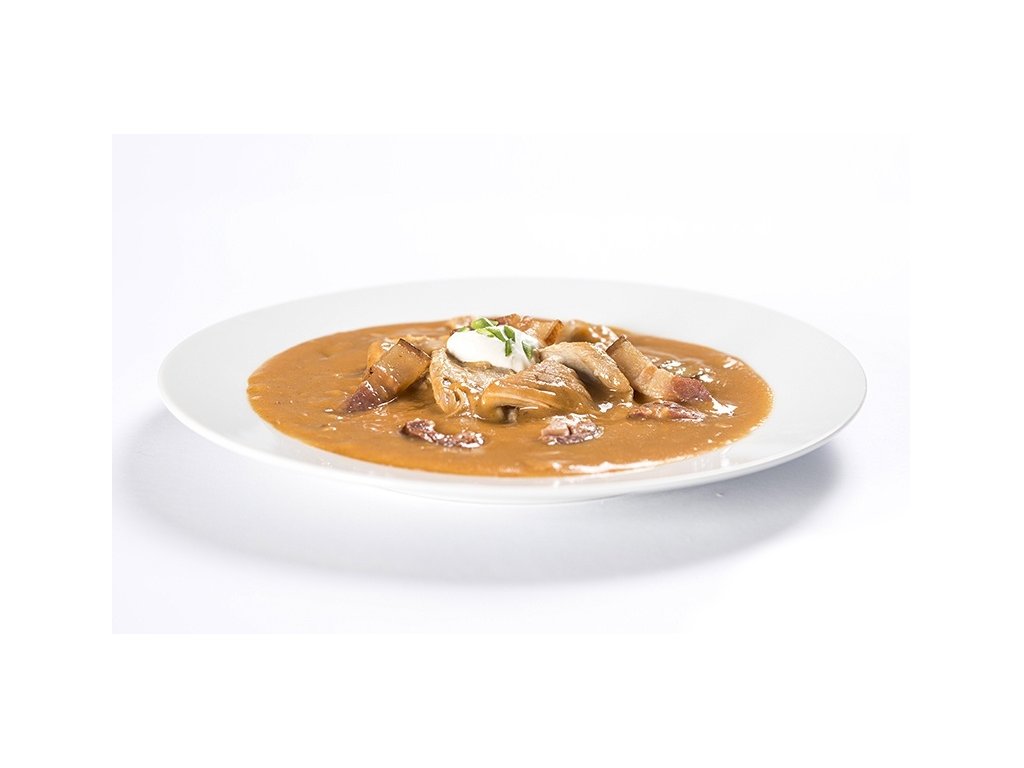 Složení: kuřecí maso (33 %), vepřová klobása (vepř. maso 86 %, voda, brambor. škrob, sůl, vepřový protein, koření), drůbeží vývar (voda, drůbeží maso a kosti), cibule, uzená slanina (vepř. sádlo), rýžová mouka, kukuřičná mouka, tvaroh, rajčatový protlak (voda, rajčatový protlak, sůl), řepkový olej, sůl kamenná, paprika mletá, pepř.