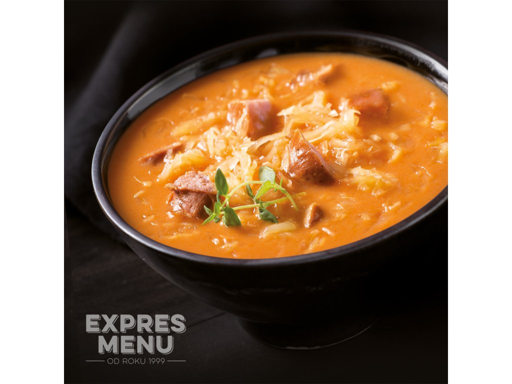 Složení: hovězí vývar (voda, hovězí maso a kosti), zelí kysané (13 %) (zelí bílé, voda, sůl, kmín), vepřová klobása (4 %) (vepřové maso 86 %, voda, bramborový škrob, sůl, vepřový protein, koření), smetana, cibule, mouka rýžová, mouka kukuřičná, řepkový olej, česnek, sůl kamenná, paprika mletá, pepř, bobkový list.