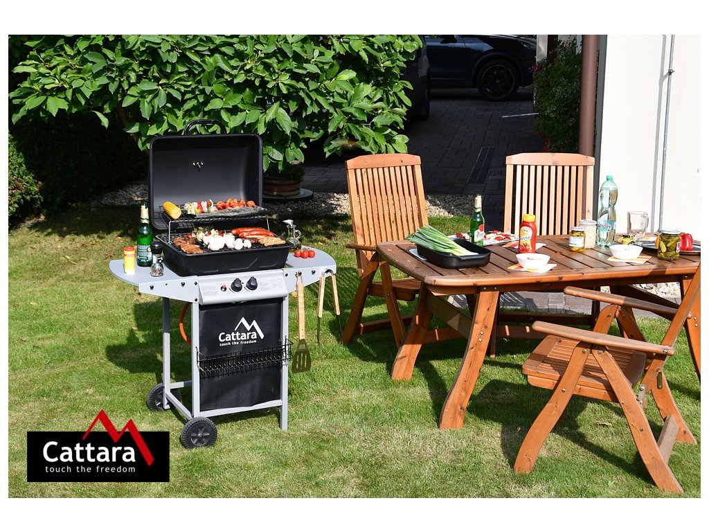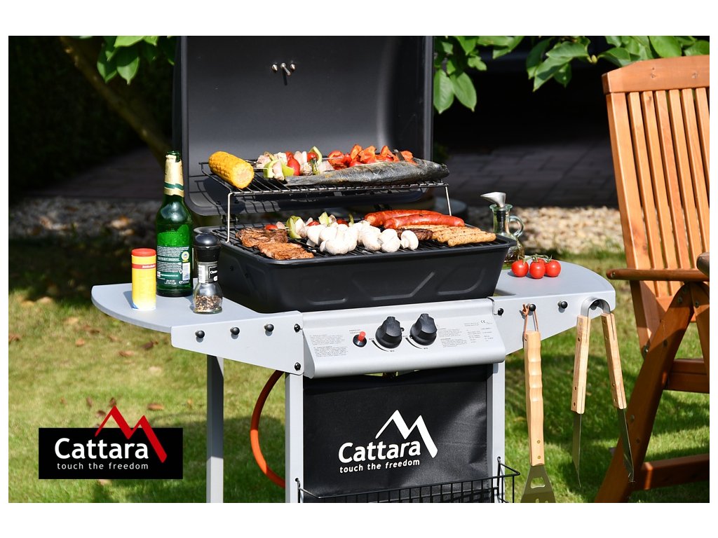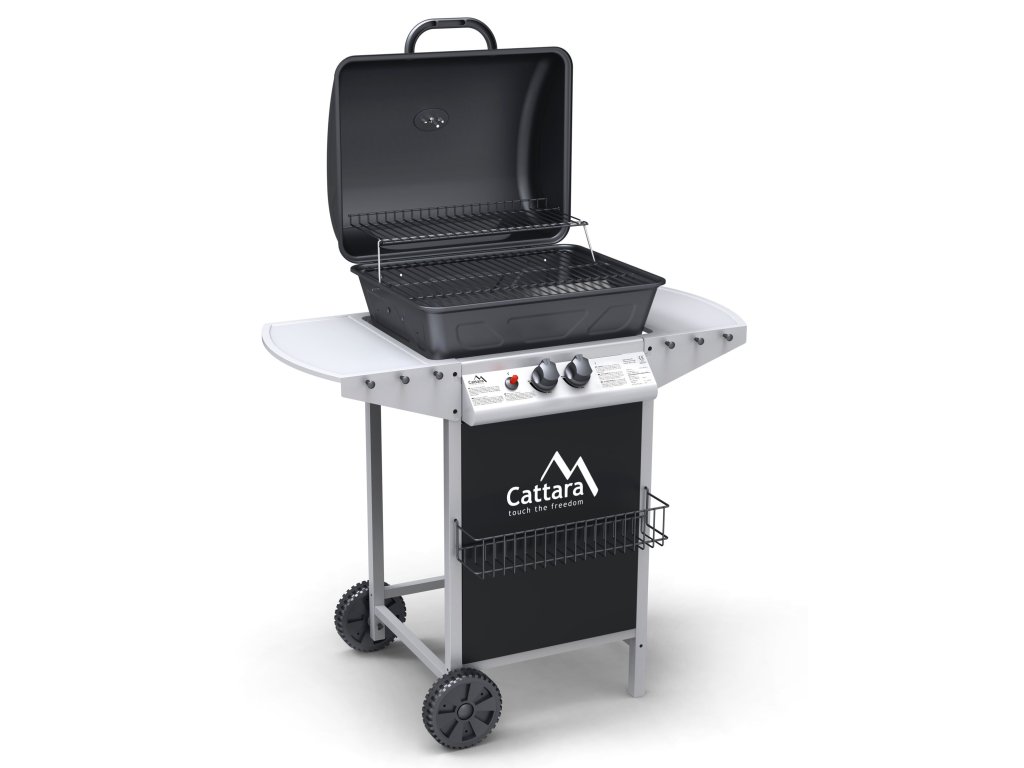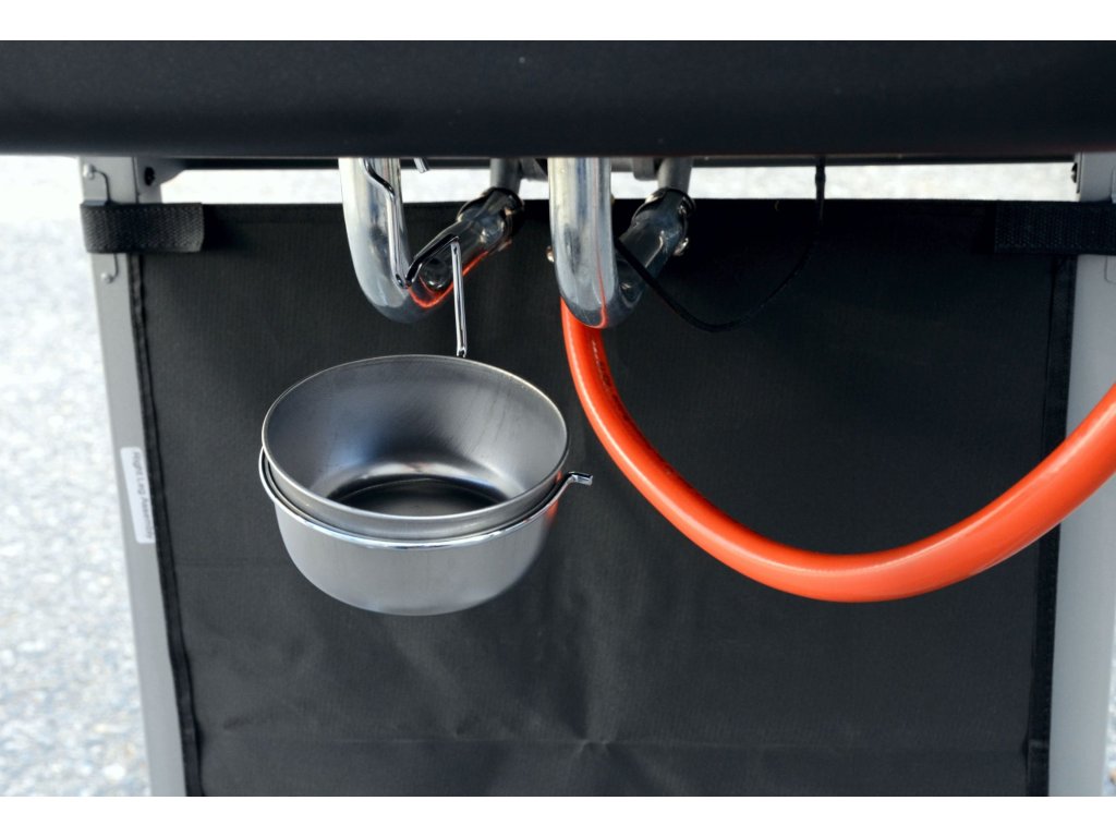 Gril je pojízdný (2 kolečka), je vybaven sklopným víkem a odkládacími poličkami na obou stranách. Součástí je i spojovací hadice k plynové lahvi a redukční ventil. Díky sklopným bočním poličkám se gril snadno skladuje.