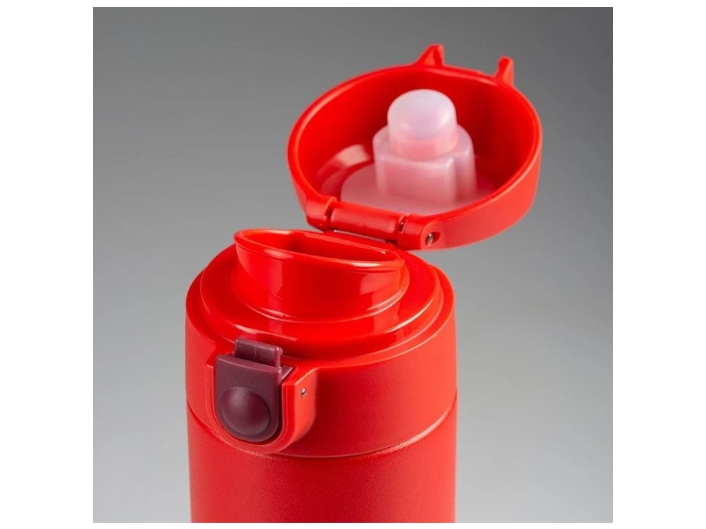 Dvouplášťový lehoučký termohrnek se šroubovacím uzávěrem, které má na vršku odklápěcí víko ovládané pomocí tlačítka.